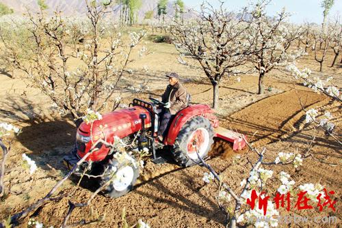 4月16日,原平市子干村民正在萬(wàn)畝梨園搶墑春耕春播。原平市農(nóng)業(yè)、農(nóng)機(jī)、農(nóng)業(yè)技術(shù)推廣中心通過(guò)“現(xiàn)場(chǎng)直播”的方式,與鄉(xiāng)村進(jìn)行對(duì)接,把旱地發(fā)展林果業(yè)和套播雜糧機(jī)播作為“一村一品”的特色之路,根據(jù)果樹(shù)樹(shù)冠的大小,合理確定種植小雜糧的品種和規(guī)模,實(shí)現(xiàn)了林糧兩不誤,收入大提高。(吉建平 攝)