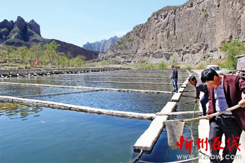 素有“江南水鄉(xiāng)”美稱的五臺縣陳家莊鄉(xiāng),是一個海拔只有640 米的秀美山鄉(xiāng),在五臺農村商業(yè)銀行“金融扶貧”、“水產信貸”等專項貸款的大力扶持下,鄉(xiāng)黨委、鄉(xiāng)政府圍繞得天獨厚的泉水資源, 號召農民發(fā)展水產養(yǎng)殖業(yè)。村民們先后建成5 個露天養(yǎng)魚場,投放名貴紅鱒魚苗150 萬尾,今年產量可望達到1.3 萬公斤,以每公斤68元的價格遠銷北京、西安,近銷太原、忻州、五臺山,年收入可達88 萬元。圖為村民們在山泉水養(yǎng)魚池撈魚。(金俊賢 鄭光 攝影報道)