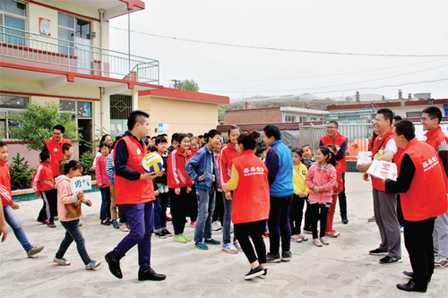 近日,太原市善林金融30 余名志愿者來到靜樂縣西會中心小學,開展關愛留守兒童志愿服務活動,為孩子們送去了排球、羽毛球、跳繩、乒乓球臺等體育用品和設備,并與孩子們分享了中國女排頑強拼搏的故事,鼓勵孩子們自強不息、快樂成長。(劉盛甫 攝)