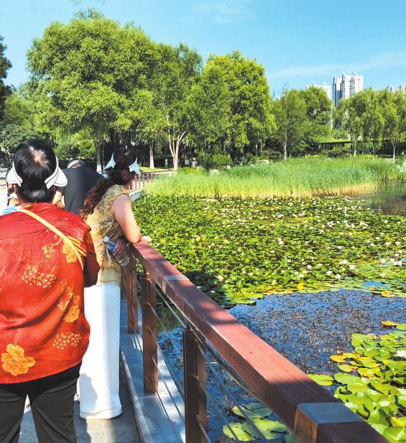 暮色漫上來時(shí),荷塘最是熱鬧。穿花裙的小娃娃踮腳摸蓮蓬,銀發(fā)的老夫妻坐在石凳上數(shù)花瓣,晚歸的人駐了步,手機(jī)鏡頭里全是荷的身影。風(fēng)推著荷浪輕搖,像在說:“別急,等你?!?/p>