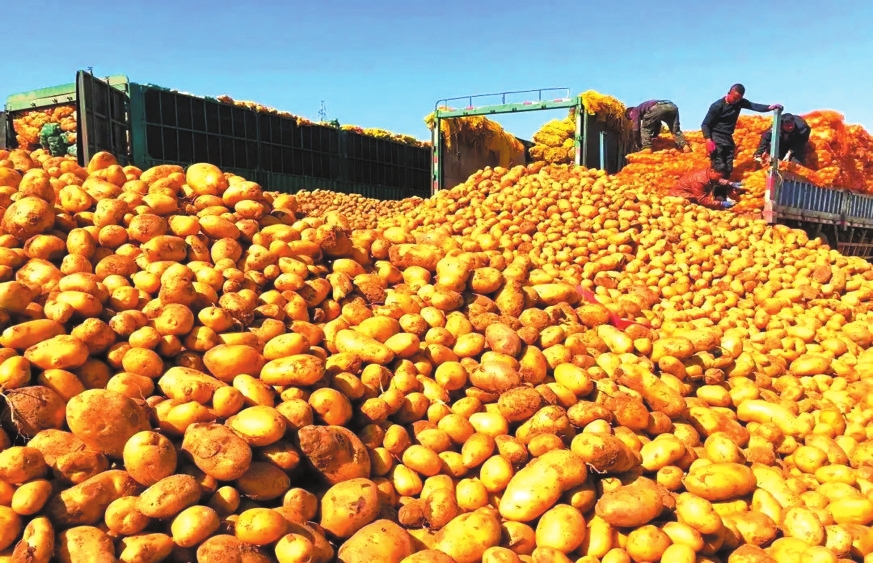 大田作物中,玉米貢獻(xiàn)了秋收“主色調(diào)”:玉米田穗大粒滿(mǎn),金黃果穗綴滿(mǎn)秸稈,機(jī)械化收割設(shè)備穿梭田間。高粱與谷子在丘陵山區(qū)長(zhǎng)勢(shì)喜人,紅透的高粱穗與沉甸甸的谷穗隨風(fēng)搖曳。土豆則以“地下黃金”之姿獲得豐產(chǎn),圓整塊莖從土壤中翻出,分揀后裝車(chē)外運(yùn)。