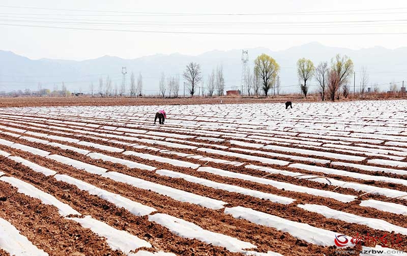 4月9日,定襄縣留念村村民搶抓農(nóng)時(shí),栽種西瓜苗、搭建瓜架,田間一派繁忙的春耕景象。(