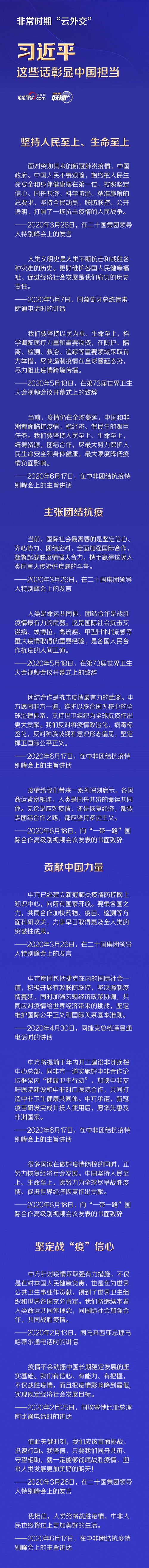 截至目前,習(xí)近平主席已經(jīng)同數(shù)十位外國領(lǐng)導(dǎo)人及國際組織負(fù)責(zé)人通話或見面,出席二十國集團領(lǐng)導(dǎo)人應(yīng)對新冠肺炎特別峰會,在第73屆世界衛(wèi)生大會視頻會議開幕式上致辭,主持中非團結(jié)抗疫特別峰會并發(fā)表主旨講話等,開啟了以電話、書信、視頻為主渠道的“云外交”模式。
