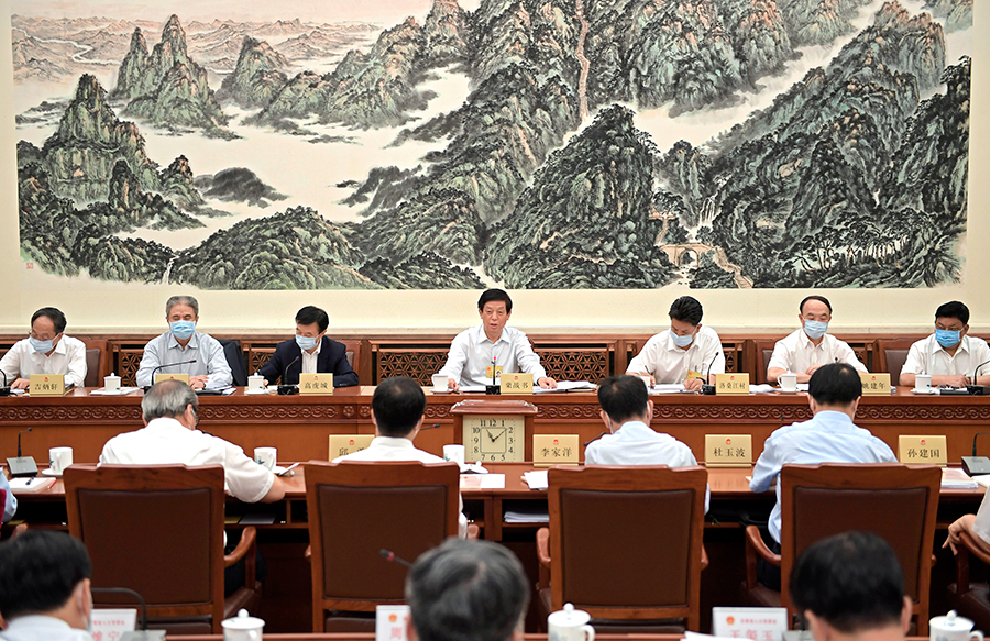 6月28日,十三屆全國(guó)人大常委會(huì)第二十次會(huì)議在北京舉行分組會(huì)議,審議香港特別行政區(qū)維護(hù)國(guó)家安全法草案。栗戰(zhàn)書委員長(zhǎng)參加審議。 新華社記者 岳月偉 攝