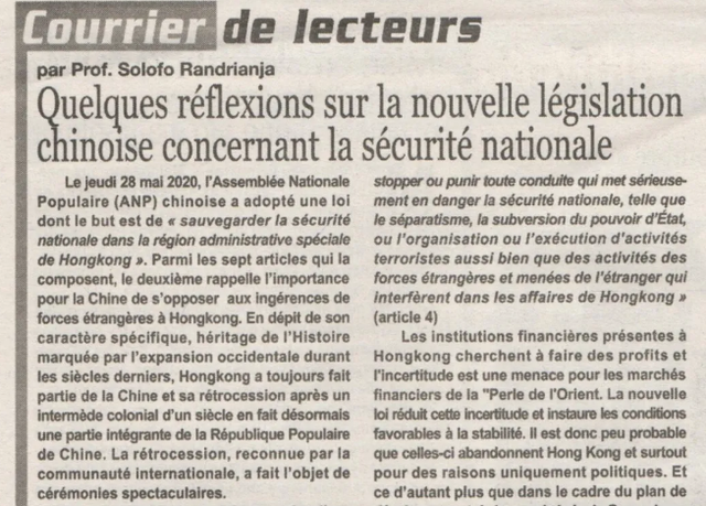 近日,馬達(dá)加斯加政治研究學(xué)院、塔馬塔夫大學(xué)教授蘇魯夫先生在馬達(dá)加斯加主流報(bào)紙上發(fā)表文章《關(guān)于對(duì)中國(guó)涉港國(guó)家安全立法的幾點(diǎn)思考》。
