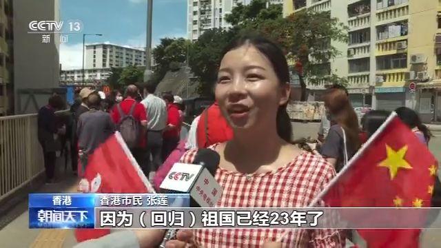 在花車巡游途中,還可以看到有大批民眾在道路兩旁,手持國旗和特區(qū)區(qū)旗,熱烈慶祝香港回歸祖國23周年。