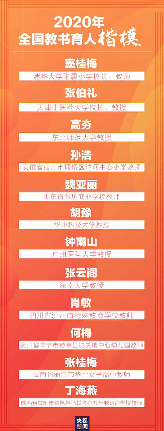 9月4日,2020年全國教書育人楷模名單發(fā)布,首次由中宣部和教育部聯(lián)合表彰,首次增加2個優(yōu)秀抗疫教師名額,共計推出12位“全國教書育人楷?!薄?/p>