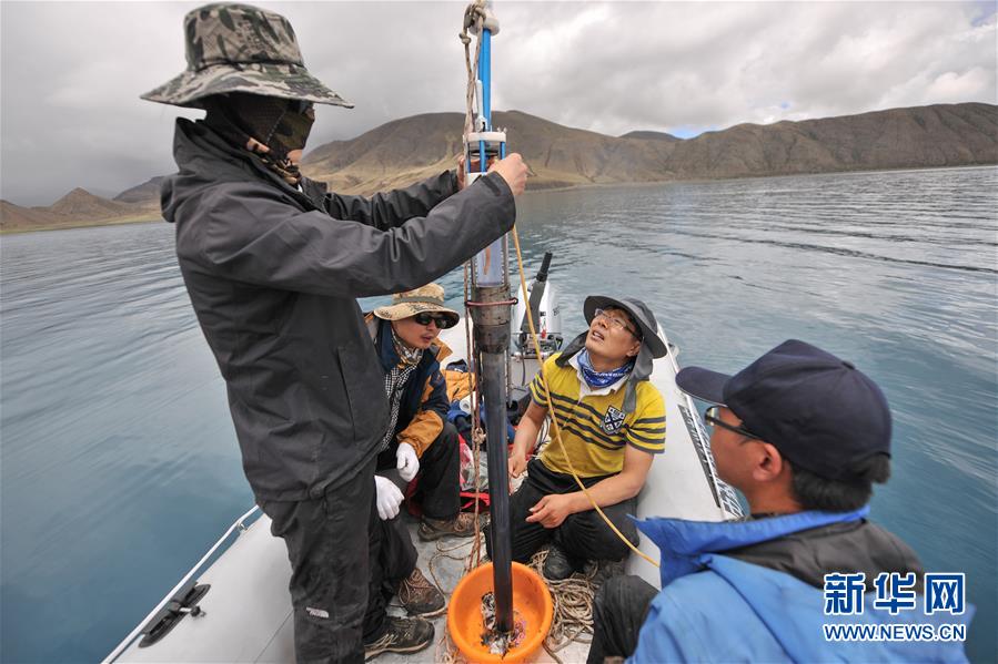 第二次青藏高原綜合科考的科考隊員在對羊卓雍錯進(jìn)行深度測量,并標(biāo)記沉積物巖芯(2019年7月22日攝)。新華社記者 晉美多吉 攝