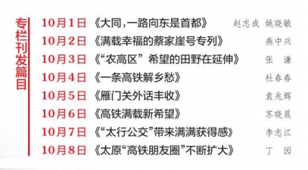 高鐵速度跑出了便捷和美好,并京“同城”夢想成真,成為“速度改變生活”的樣本,京晉經(jīng)濟文化交流更加密切;“蔡家崖號”穿行呂梁山間,為沿線貧困地區(qū)提供著源源不斷的脫貧助力,帶來看得見的變化、穩(wěn)得住的幸福。今年國慶期間,本報開設(shè)《坐著火車看山西》專欄,記者踏上火車,體驗生活,假期8天刊發(fā)8篇稿件,展示“十三五”期間我省經(jīng)濟社會發(fā)展的巨大變化。