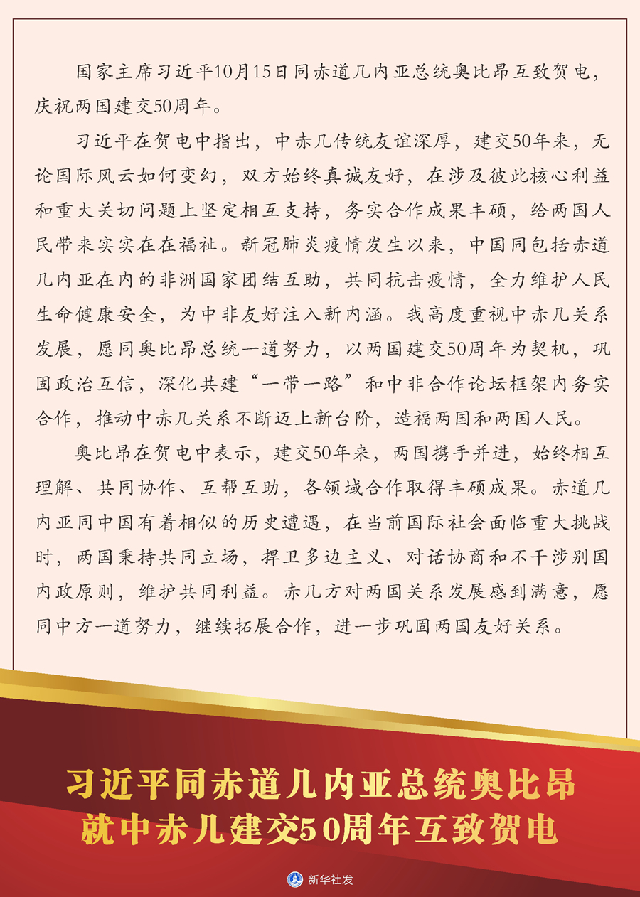 習(xí)近平在賀電中指出,中赤幾傳統(tǒng)友誼深厚,建交50年來(lái),無(wú)論國(guó)際風(fēng)云如何變幻,雙方始終真誠(chéng)友好,在涉及彼此核心利益和重大關(guān)切問(wèn)題上堅(jiān)定相互支持,務(wù)實(shí)合作成果豐碩,給兩國(guó)人民帶來(lái)實(shí)實(shí)在在福祉。新冠肺炎疫情發(fā)生以來(lái),中國(guó)同包括赤道幾內(nèi)亞在內(nèi)的非洲國(guó)家團(tuán)結(jié)互助,共同抗擊疫情,全力維護(hù)人民生命健康安全,為中非友好注入新內(nèi)涵。我高度重視中赤幾關(guān)系發(fā)展,愿同奧比昂總統(tǒng)一道努力,以兩國(guó)建交50周年為契機(jī),鞏固政治互信,深化共建“一帶一路”和中非合作論壇框架內(nèi)務(wù)實(shí)合作,推動(dòng)中赤幾關(guān)系不斷邁上新臺(tái)階,造福兩國(guó)和兩國(guó)人民。