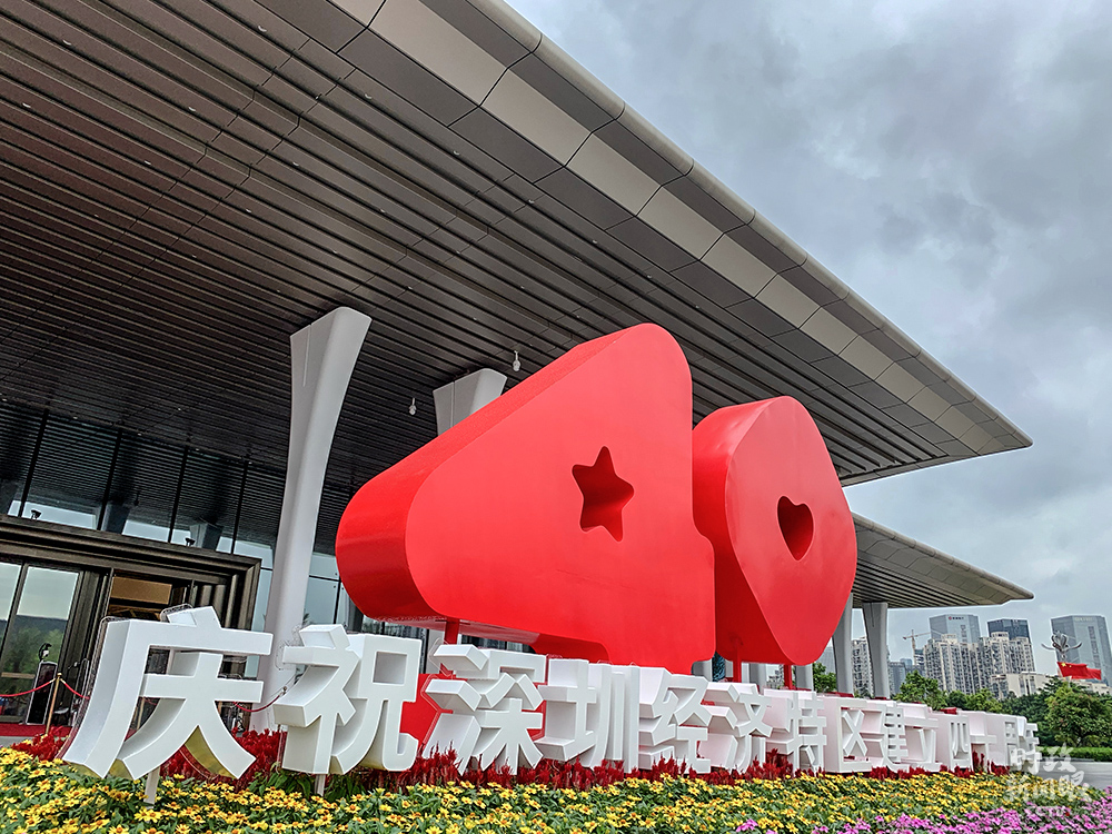 △“40”是慶祝大會(huì)當(dāng)天最醒目、設(shè)計(jì)最獨(dú)特的數(shù)字。4里面是一顆五角星,取自五星紅旗,0里面是一顆愛心,這個(gè)標(biāo)識(shí)的名字叫做“星心相映”,寓意著深圳是一顆明日之星,也是一座愛心之城。(總臺(tái)央視記者程鋮拍攝)