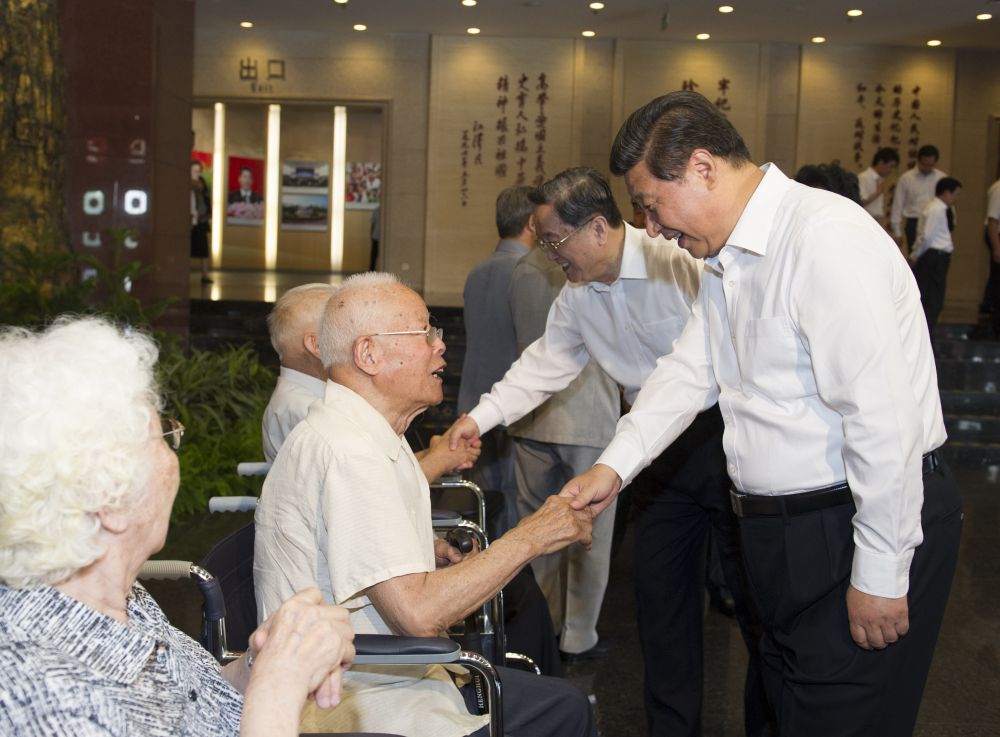 2014年7月7日,首都各界在中國人民抗日戰(zhàn)爭紀(jì)念館隆重集會,紀(jì)念全民族抗戰(zhàn)爆發(fā)77周年。習(xí)近平出席紀(jì)念儀式并發(fā)表重要講話。這是參觀結(jié)束后,習(xí)近平等親切看望參加儀式的抗戰(zhàn)老戰(zhàn)士和老同志代表。
