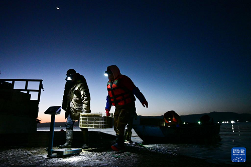 10月18日,庫(kù)區(qū)漁民將一箱剛捕撈的小銀魚(yú)上秤稱(chēng)重。(新華社記者 齊芷玥 攝)