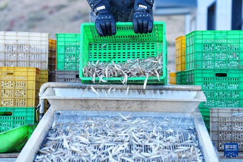 10月18日,在青海省海南藏族自治州共和縣龍羊新村龍羊峽海湖漁業(yè)捕撈合作社,工人收拾新捕的小銀魚(yú)。(新華社記者 齊芷玥 攝)