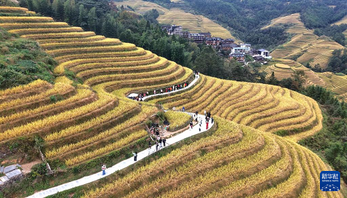 眼下,廣西龍勝各族自治縣龍脊梯田一片金黃,成為眾多游客觀光“打卡”的熱門景點。龍脊梯田已有2300多年歷史,是聯(lián)合國糧農(nóng)組織認(rèn)證的全球重要農(nóng)業(yè)文化遺產(chǎn)。