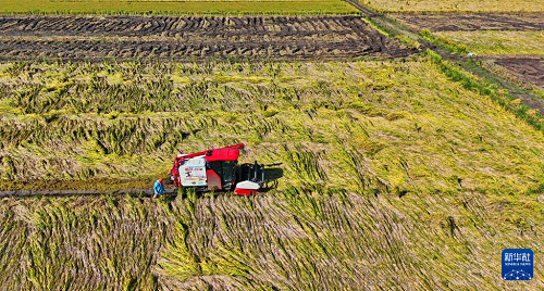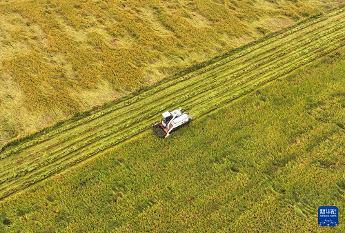 10月22日,種植戶在江蘇省連云港市贛榆區(qū)城官村田間收獲水稻(無(wú)人機(jī)照片)。(新華社發(fā) 耿玉和 攝)