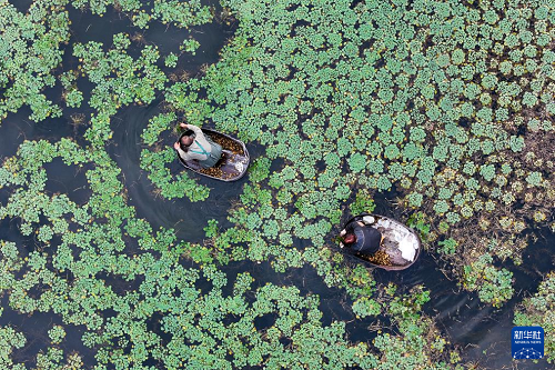 10月22日,浙江省湖州市吳興區(qū)東林鎮(zhèn)泉心村村民劃著菱桶采摘菱角(無(wú)人機(jī)照片)。(新華社發(fā) 何偉衛(wèi) 攝)