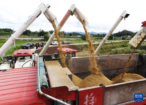 10月22日,在四川省達(dá)州市大竹縣石橋鋪鎮(zhèn)長(zhǎng)青村的稻田間,農(nóng)機(jī)手將收獲的水稻裝入運(yùn)糧車(chē)。(新華社發(fā) 鄧良奎 攝)