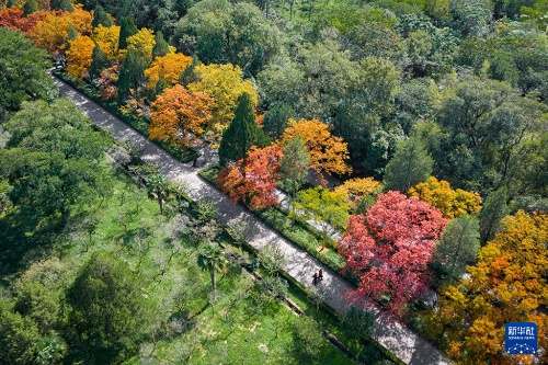 10月23日,游客在江蘇南京明孝陵景區(qū)石象路觀(guān)賞秋景(無(wú)人機(jī)照片)。(新華社發(fā) 蘇陽(yáng) 攝)