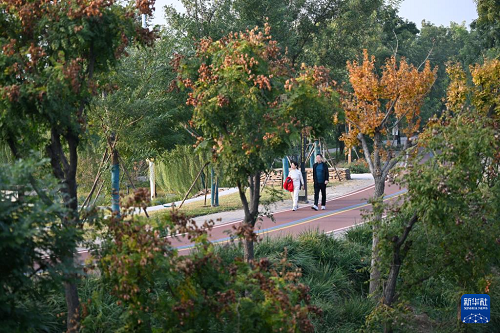 10月29日,市民在河北省滄州市運(yùn)河區(qū)大運(yùn)河堤頂路上散步。(新華社記者 牟宇 攝)