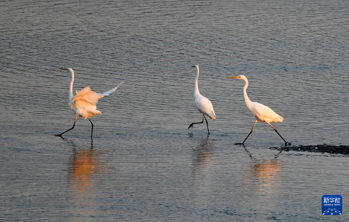 11月3日,在黑龍江省牡丹江市江心島附近的江灘淺流中,白鷺在覓食。(新華社發(fā) 張春祥 攝)