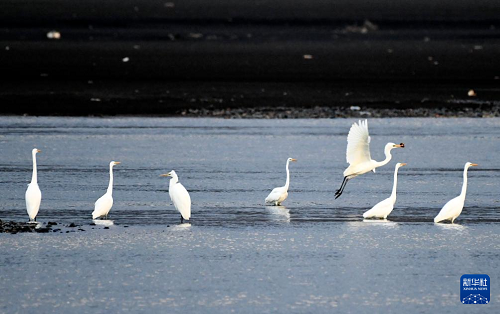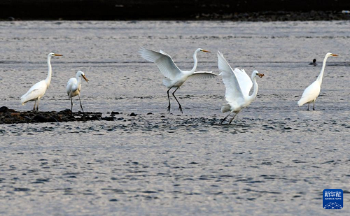 11月4日,在黑龍江省牡丹江市江心島附近的江灘淺流中,白鷺在覓食。(新華社發(fā) 張春祥 攝)
