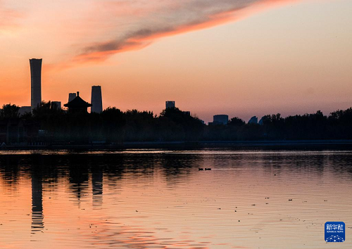 11月10日清晨,北京上空晨曦微露,霞光滿天。中國尊、望海樓等地標建筑在晨光中與什剎海光影交錯。