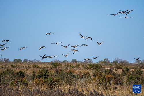 11月13日,山東黃河三角洲國家級自然保護(hù)區(qū)內(nèi),越冬候鳥在飛翔。(新華社記者 朱崢 攝)