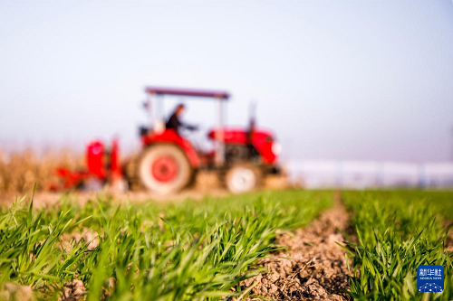 11月19日,在河南省商丘市睢縣鳳城街道劉樓村一處農(nóng)田內(nèi),農(nóng)機手駕駛播種機播種冬小麥。(新華社發(fā) 徐澤源 攝)