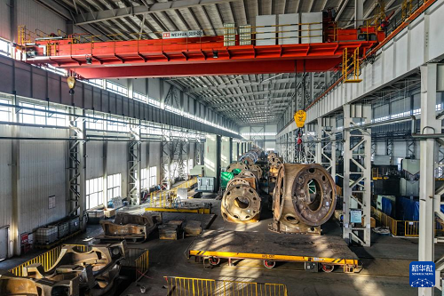 這是11月20日在甘肅省酒泉經(jīng)濟(jì)技術(shù)開發(fā)區(qū)日月重工(甘肅)有限公司拍攝的待出廠的風(fēng)機(jī)輪轂(無(wú)人機(jī)照片)。(新華社記者 張智敏 攝)