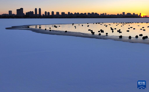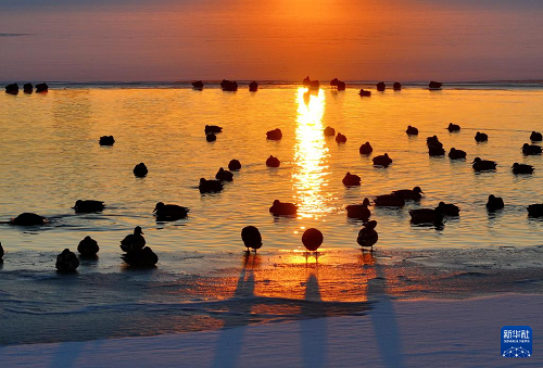 11月27日,一群綠頭鴨聚集在降雪后的松花江哈爾濱段未結(jié)冰水域覓食、休憩。落日金暉映照下,白雪、寒江和綠頭鴨組成了一幅寒江“戲雪”畫卷。