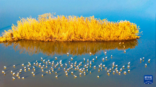 12月8日,群鳥在江蘇興化里下河國家濕地公園內棲息、覓食(無人機照片)。(新華社發(fā) 周社根 攝)