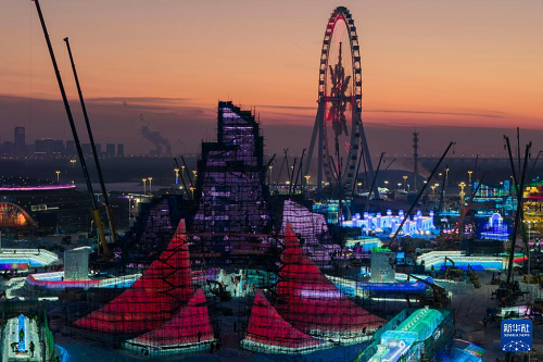 第二十七屆哈爾濱冰雪大世界主塔“冰燈啟夢”封頂