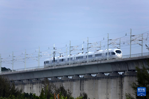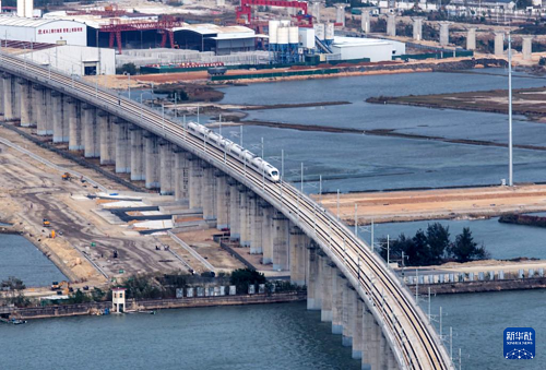 這是12月22日拍攝的行駛在汕頭濠江特大橋上的高鐵列車(chē)。(新華社發(fā) 姚軍 攝)