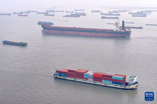 眾多貨船行駛在長江江蘇南通段江面上(11月5日攝,無人機照片)。(新華社發(fā) 許叢軍 攝)