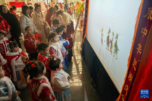 12月30日,四川省眉山市彭山區(qū)學(xué)院路幼兒園小朋友在區(qū)文化館新春非遺市集活動(dòng)上觀看非遺皮影戲。(新華社發(fā) 翁光建 攝)