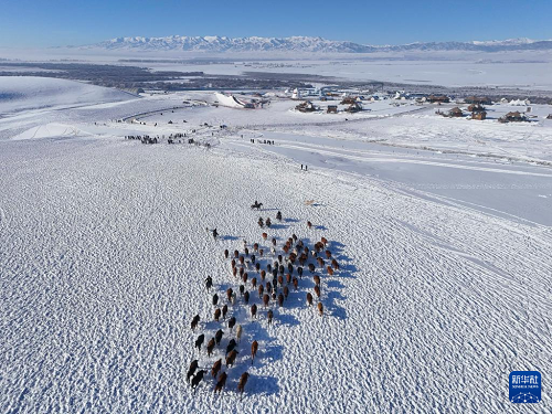 這是1月3日在新疆昭蘇濕地公園拍攝的“天馬踏雪”表演(無(wú)人機(jī)照片)。(新華社記者 胡虎虎 攝)