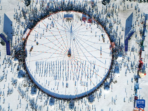 1月8日,在吉林省松原市,人們參加吉林·查干湖第24屆冰雪漁獵文化旅游節(jié)開幕式(無(wú)人機(jī)照片)。(新華社記者 顏麟蘊(yùn) 攝)