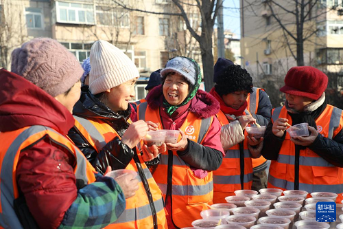 1月25日,在河北省唐山市豐潤(rùn)區(qū)燕山路街道欣園社區(qū),環(huán)衛(wèi)工人品嘗志愿者送來(lái)的臘八粥。(新華社發(fā) 朱大勇 攝)