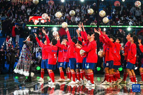2月3日,孩子們?cè)?026貴州“村晚”現(xiàn)場(chǎng)表演“村超”節(jié)目。(新華社記者 楊文斌 攝)