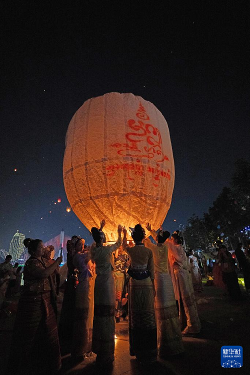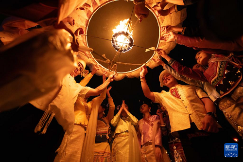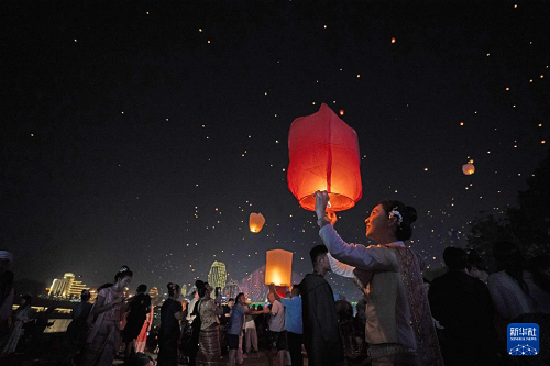 4月13日晚,云南省西雙版納傣族自治州景洪市瀾滄江畔,來自五湖四海的游客和當?shù)厝罕娨黄?,將一盞盞寫滿祝福的孔明燈放飛,空中燈火如星河倒懸,與江面波光交相輝映。