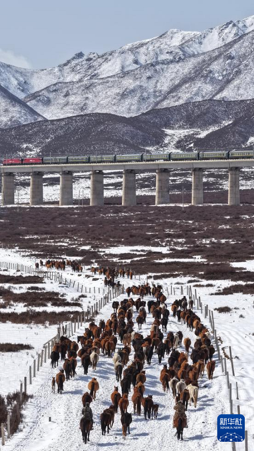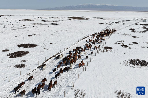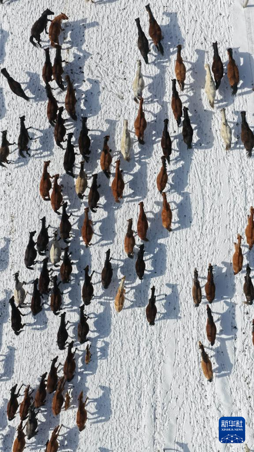4月14日,山丹馬場的牧馬人組織馬群轉(zhuǎn)場(無人機照片)。(新華社發(fā) 王超 攝)