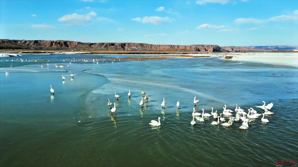 入春,黃河開河以來,成百上千的白天鵝翩躚而至,成為河曲娘娘灘水域的一道風景線。(