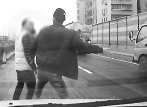 在郭先生轎車(chē)的行車(chē)記錄儀的錄像中,郭先生拿著手機(jī)站在車(chē)頭,另外兩名男子也跟了上來(lái),雙方隨后發(fā)生言語(yǔ)沖突,其中一名身穿黑色外套的男子更是動(dòng)手拍打郭先生的臉部,隨后,郭先生還被黑衣男子推打。