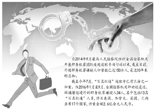 據了解,截至今年7月,“百名紅通”逃犯中已有三分之一歸案。僅2016年1月至9月,全國檢察機關即勸返遣返、緝捕潛逃境外的職務犯罪嫌疑人34人,其中包括裴健強、陳祎娟、付耀波、周世勤等13名“百名紅通”人員,涉及美國、加拿大、英國、幾內亞等17個國家,涉案金額2.6億余元人民幣。