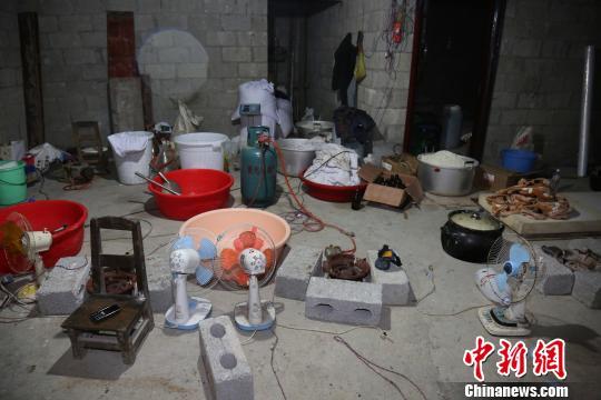清晨6時,隨著現(xiàn)場指揮長的一聲令下,在山林里潛伏數(shù)小時的抓捕組民警直沖制毒窩點,將正在制造毒品的8名犯罪嫌疑人抓獲。