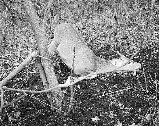 野生梅花鹿,左前腿被吊住,整個(gè)軀體呈半懸空狀態(tài),不停痛苦掙扎。