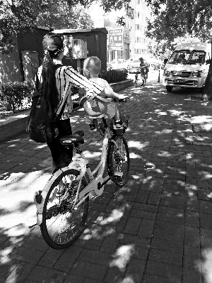 日前,記者在北京街頭遇到了一位母親,推著一輛ofo共享單車,車把上裝了一個(gè)塑料兒童座椅,里面坐著一個(gè)看上去一歲多的孩子,家長(zhǎng)一邊走一邊和他人聊天,之后一起騎車過了馬路。