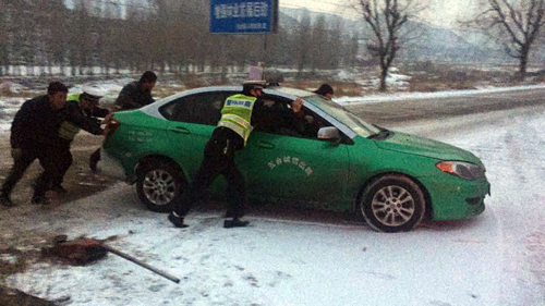 風雪中,執(zhí)勤民警秉承不怕苦、不怕累的敬業(yè)精神,頂著寒風、冒著雪指揮疏導交通,確保廣大群眾出行安全暢通。時而能在各個路段看到他們從容地指揮車流;時而在各個主干道警示過往車輛注意行車安全;時而能看到他們在幫助受困車輛安裝防滑鏈;時而能看到他們頂著寒風和冷雪,幫助由于積雪導致車輛停留不前的司機推車前行;時而能看到他們?yōu)闇糗囕v提供服務……這些場景,交織成一道道亮麗的風景線,詮釋著新時期公安交警戰(zhàn)風雪,保平安,全心全意為人民服務的宗旨。