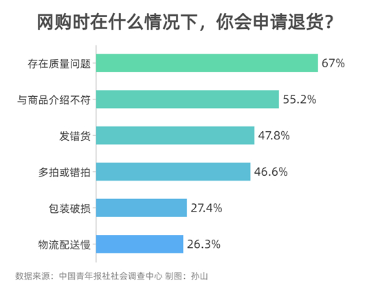 在“3·15國際消費者權益日”到來之際,中國青年報社社會調(diào)查中心聯(lián)合問卷網(wǎng)(wenjuan.com),對1531名受訪者進行的一項調(diào)查顯示,存在質(zhì)量問題(67.0%)是受訪者退貨的主要情況,然后是與商品介紹不符(55.2%)。59.4%的受訪者感覺在網(wǎng)購退貨上存在流程繁瑣的問題。